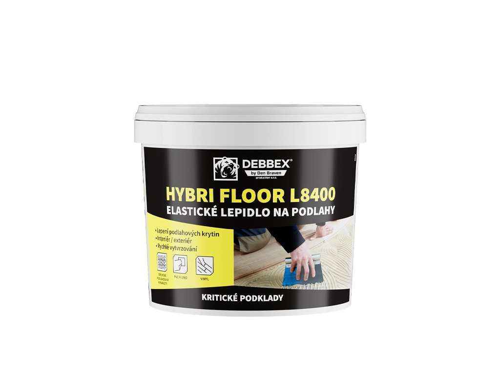 Kbelík 5 kg. Elastické lepidlo na podlahy HYBRI FLOOR L8400 je jednosložkové vysokomodulové lepidlo, na bázi MS polymeru, vytvrzující vulkanizací vzdušné vlhkosti, vytvářející trvale pevný spoj odolný vlhku a vodě. Na savé i nesavé podklady. Zabezpečuje rovnou pokládku parket na nerovném podkladu. Vhodný pro lepení vinylových podlah. Zvuková a anti-vibrační izolace, snižuje kročejový hluk. Vysoká přilnavost na dřevo, kov, dlažbu a beton. Extrémní přídržnost k podkladu. Barva: světle hnědá.