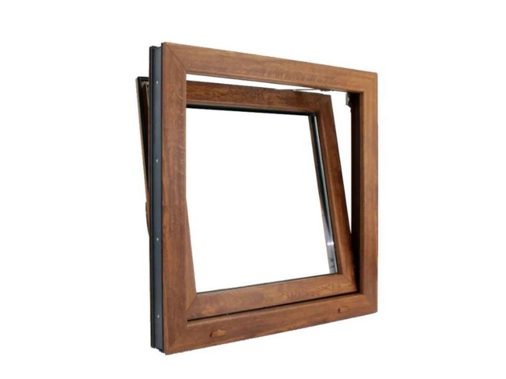 Plastové okno otevíravo-sklopné, včetně polohy ventilace. V barvě - bílé z interiéru / zlatý dub z exteriéru. Venkovní rozměr rámu okna 90x60 cm. Okno s 4komorovým kvalitním Aplast 60 mm profilem. Zasklení izolačním dvojsklem s prostupností tepla Uw 1,6 m2K, Ug 1,1 m2K.