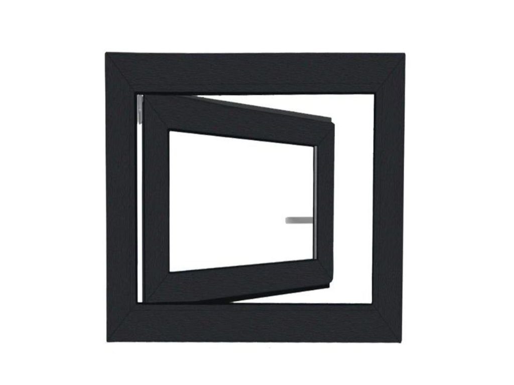 Plastové okno otevíravo-sklopné, včetně polohy ventilace. V barvě - bílé z interiéru /antracit 7016 z exteriéru. Venkovní rozměr rámu okna 90x90 cm. Okno s 4-komorovým kvalitním Aplast 60 mm profilem v ceně s klikou. Zasklení izolačním dvojsklem s prostupností tepla Uw 1,6 m2K, Ug 1,1 m2K.