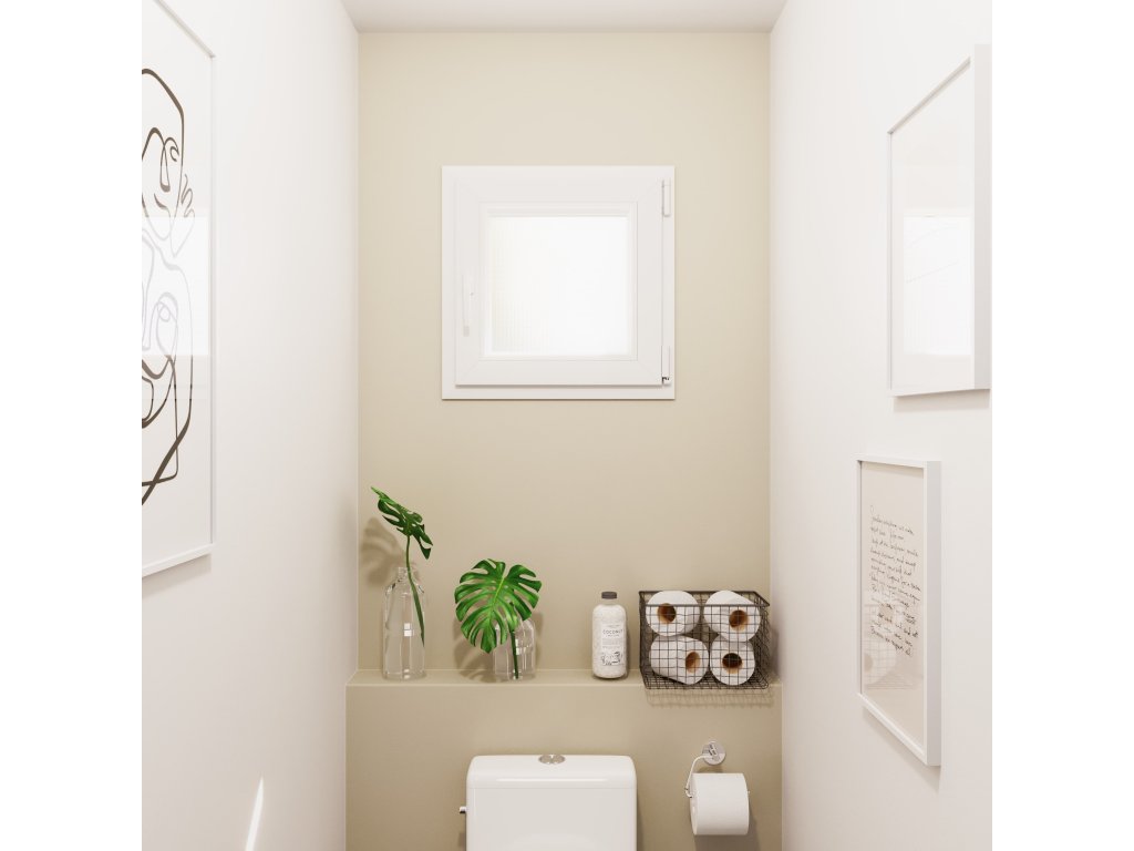Plastové okno otevíravo-sklopné, včetně polohy ventilace. V barvě - bílé z interiéru / zlatý dub z exteriéru. Venkovní rozměr rámu okna 90x90 cm. Okno s 4komorovým kvalitním Aplast 60 mm profilem. Zasklení izolačním dvojsklem s prostupností tepla Uw 1,6 m2K, Ug 1,1 m2K.